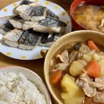 今日の晩ごはんはサゴシの竜田揚げと、うっかり煮込み過ぎてイモがぐずぐずになっちゃった肉じゃがだったわよー。 https://twitter.com/atomucchi/status/1466774581348560900/photo/1