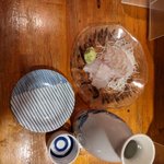 今日はあまり気分乗らないのでえじりさんだけ♪ フグ唐揚、マゴチ刺身🤤 冷酒は喜平生原酒