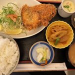 特大アジフライ定食。胃がもたれそうで大のアジフライにしたけど、身がふわふわしていてめちゃめちゃ美味しかった