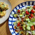 ブリのキムチ炒め、ミニトマトとツナのチーズ焼き、キュウリと新玉ねぎのサラダ、野菜のお味噌汁です
