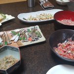 15時Open!刺身はカツオ、つぶ貝、赤貝の3種盛り。煮付けファン歓喜のメバル煮付けや、恵那鶏うまだれ焼き、久々にラム肉しゃぶしゃぶサラダ、うずら卵のわさび醤油漬け、酒進む豆腐味噌漬けなど。〆にはざるほうとう登場です!人気のじゃこ… https://twitter.com/i/web/status/1528199434139746304