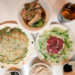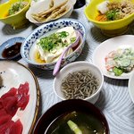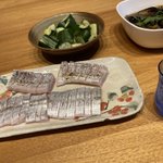 小松菜と魚の煮付、ニラ玉ねぎチーズチヂミ、馬刺し。 煮魚は夫が釣ってきてたマゴチとかいう