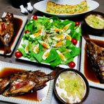 メバル煮付け、サラダ菜茹で卵胡瓜のサラダ、栃尾揚げ葱味噌焼き、大根じゃが芋お揚げのお味噌汁 メバルが安かったので煮付けにしました。美味しかったー😀 #Twitter家庭料理部 https://twitter.com/mihhohchang1970/status/1537053059590721537/photo/1