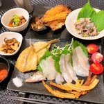 シロギスお刺身・天ぷら・卵煮付け・骨せんべい、アジたたき、イシモチ塩焼き、イイダコガリバタ醤油炒め。イイダコ美味しすぎてもっと食べたい…