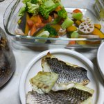 今日の晩ご飯は蒸し野菜とチヌ(黒鯛)の塩焼き