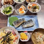 ばら寿司、サゴシの塩焼き、昨日の残りのとん汁。 餃子は温めすぎて焦げましたね