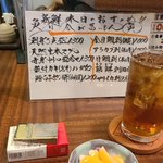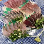 刺身3種盛り(アジ、サゴシ、太刀魚)サゴシの炙り、〆サゴシ、炙り鮨、太刀チャンジャ、太刀の梅肉和え。 優勝は、サゴシの炙りでした