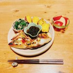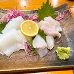 イワシの刺身、焼き牡蠣、ホタルイカ醤油漬け🦑