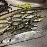 沼津沖 タチウオ 夕方〜20時頃まで クイクイ 後半大失速⤵️ アタリは昨日よりも多くジギングもよく触りました テンヤで1.6キロ上がってます 凄い