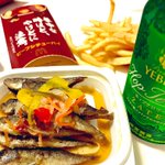 マクドナルドの ビーフシチューパイと 豆アジの南蛮漬けを ビールでお迎え