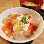 #地どれ海鮮丼 今日は月曜日に旦那が釣ってきたメジナとチヌの海鮮丼にとびこトッピング